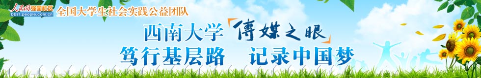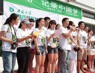 西南大學(xué)“傳媒之眼”社會(huì)實(shí)踐隊(duì)由新聞傳媒學(xué)院團(tuán)委老師李海峰、范曦帶隊(duì),8名研究生、19名本科生組成。團(tuán)隊(duì)圍繞“篤行基層路,記錄中國夢(mèng)”的主題,自7月3日開始,從建設(shè)生態(tài)北碚、“百姓中國夢(mèng)”主題宣講、“幸福重慶”人文記錄、“山城百姓”社會(huì)調(diào)查四個(gè)方面開展活動(dòng)。團(tuán)隊(duì)已經(jīng)在歇馬鎮(zhèn)碚青路中心廣場(chǎng)舉行了文藝匯演,并給群眾帶來了各種各樣的避暑藥品;到歇馬污水處理廠,了解當(dāng)?shù)厣a(chǎn)生活污水的處理;到重慶歇馬機(jī)械曲軸有限公司,宣傳“節(jié)能生產(chǎn)”理念,在員工中開展環(huán)保培訓(xùn),強(qiáng)調(diào)可持續(xù)生產(chǎn)和發(fā)展。