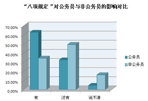 截至2013年12月20日10時(shí),共收到網(wǎng)絡(luò)問(wèn)卷2442份,48.4%的受訪者認(rèn)為“八項(xiàng)規(guī)定”對(duì)個(gè)人生活有影響,其中公務(wù)員群體認(rèn)為“八項(xiàng)規(guī)定”帶來(lái)的最大影響是“公務(wù)吃請(qǐng)少了,能抽出更多時(shí)間陪伴家人”和“津貼補(bǔ)貼獎(jiǎng)金少了,勒緊褲帶過(guò)日子”,非公務(wù)員群體認(rèn)為“八項(xiàng)規(guī)定”帶來(lái)的最大影響是“酒店、高端會(huì)所門(mén)外的公務(wù)用車(chē)少了”和“遇到領(lǐng)導(dǎo)考察工作時(shí),地毯鮮花迎送領(lǐng)導(dǎo)的情況少了”。