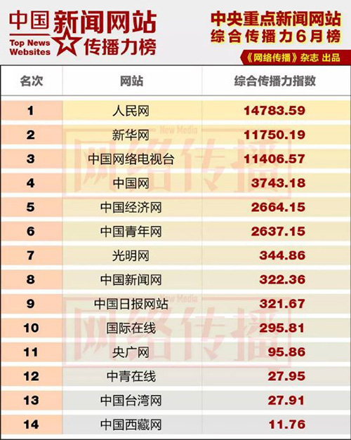 近日,中央網(wǎng)信辦《網(wǎng)絡(luò)傳播》雜志推出2015年6月“中國(guó)新聞網(wǎng)站傳播力榜”,人民網(wǎng)排名位居14家中央重點(diǎn)新聞網(wǎng)站首位。新華網(wǎng)、中國(guó)網(wǎng)絡(luò)電視臺(tái)分列第二、第三名。