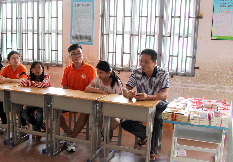 方銀城校長(zhǎng)(右一)給志愿者們講述他與峰頭小學(xué)的故事