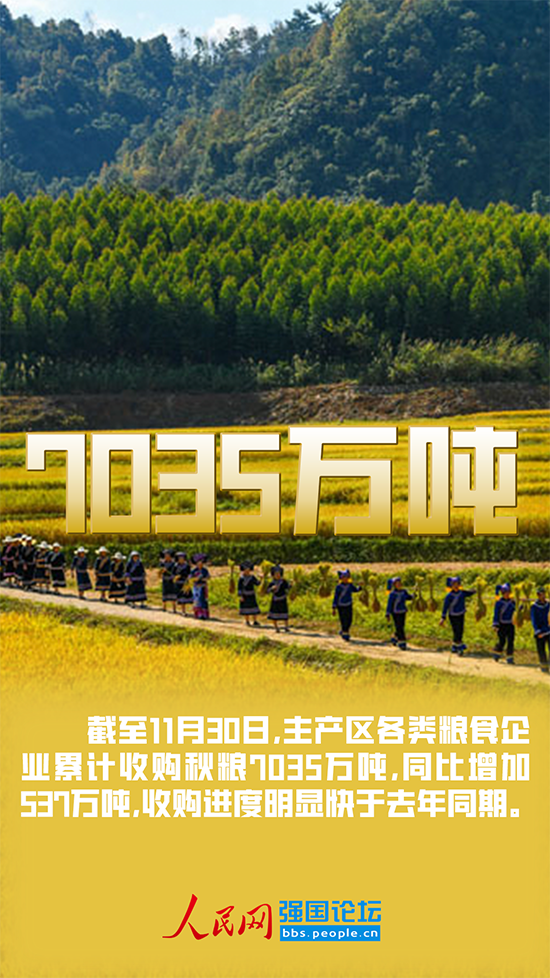隨著各地大規(guī)模秋收結(jié)束,秋糧開始集中上市交易。據(jù)國家糧食和物資儲(chǔ)備局最新發(fā)布,截至11月30日,主產(chǎn)區(qū)各類糧食企業(yè)累計(jì)收購秋糧7035萬噸,同比增加537萬噸,收購進(jìn)度明顯快于去年同期!跋啾扔2021年、2020年、2019年的6498萬噸、6803萬噸、5614萬噸,與歷年同期相比,今年達(dá)到了近年來糧食企業(yè)秋糧收購數(shù)量的最高值。”李新海說道。